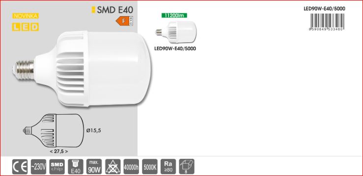 LED žiarovka 90W-E40 / 5000K má svietivosť ako klasická cca 860W žiarovka.