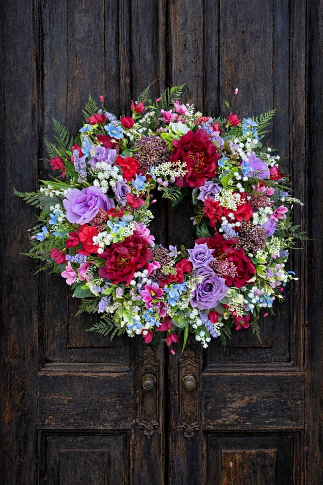 Celoročný veniec na dvere s umelými pivóniami a ružami