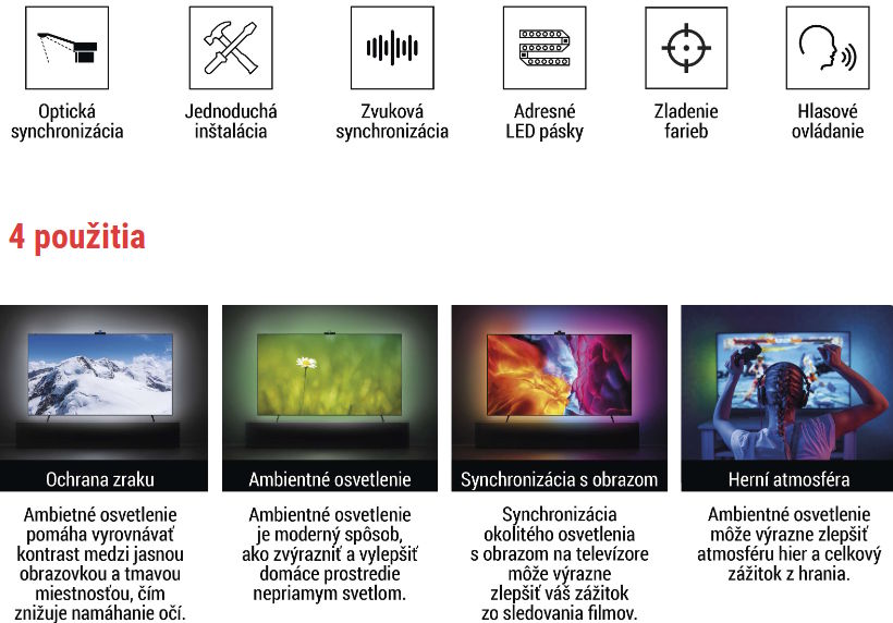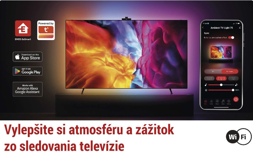 Osvetlenie GoSmart Ambient LED TV posúva zážitok zo sledovania televízora na úplne novú úroveň. Vďaka synchronizačnej kamere HD sa podsvietenie automaticky prispôsobuje farbám na obrazovke a vytvára dokonalý vizuálny efekt. Všetko ovládanie a nastavenia sa vykonávajú prostredníctvom mobilnej aplikácie EMOS GoSmart, ktorá je k dispozícii pre systémy Android aj iOS.