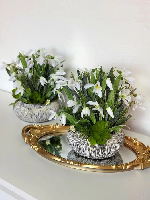 Jarný aranžmán s umelými snežienkami s imitáciou rannej rosy, v cementovej miske.