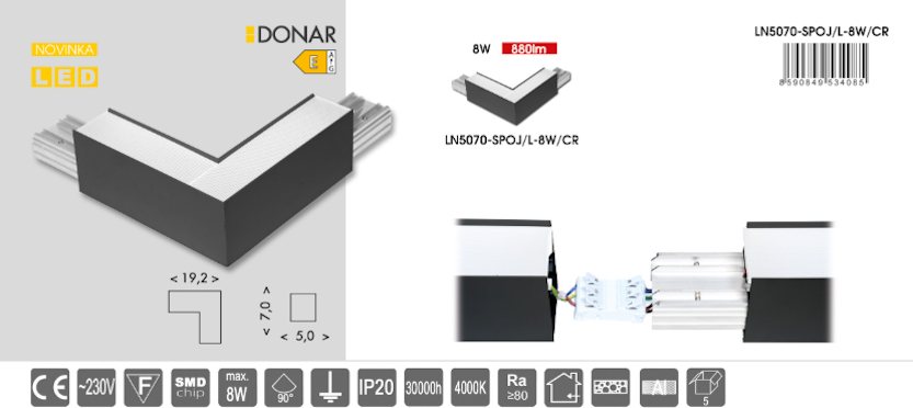 Svietiace spojky LN5070-SPOJ slúžia na napojenie na rovné svietidlá z radu DONAR. Majú vlastný predradník, ale nedisponujú vlastným prívodným káblom, takže ich nemožno používať samostatne. Každý produkt z radu je vyrobený z liateho hliníka a navrhnutý tak, aby ho bolo možné vzájomne kombinovať a vytvárať tak vizuálne pútavé zostavy, ktoré poskytnú dostatok svetla. Vďaka mikroprizmatickému krytu a užšiemu vyžarovaciemu lúču navyše šetrí zrak.