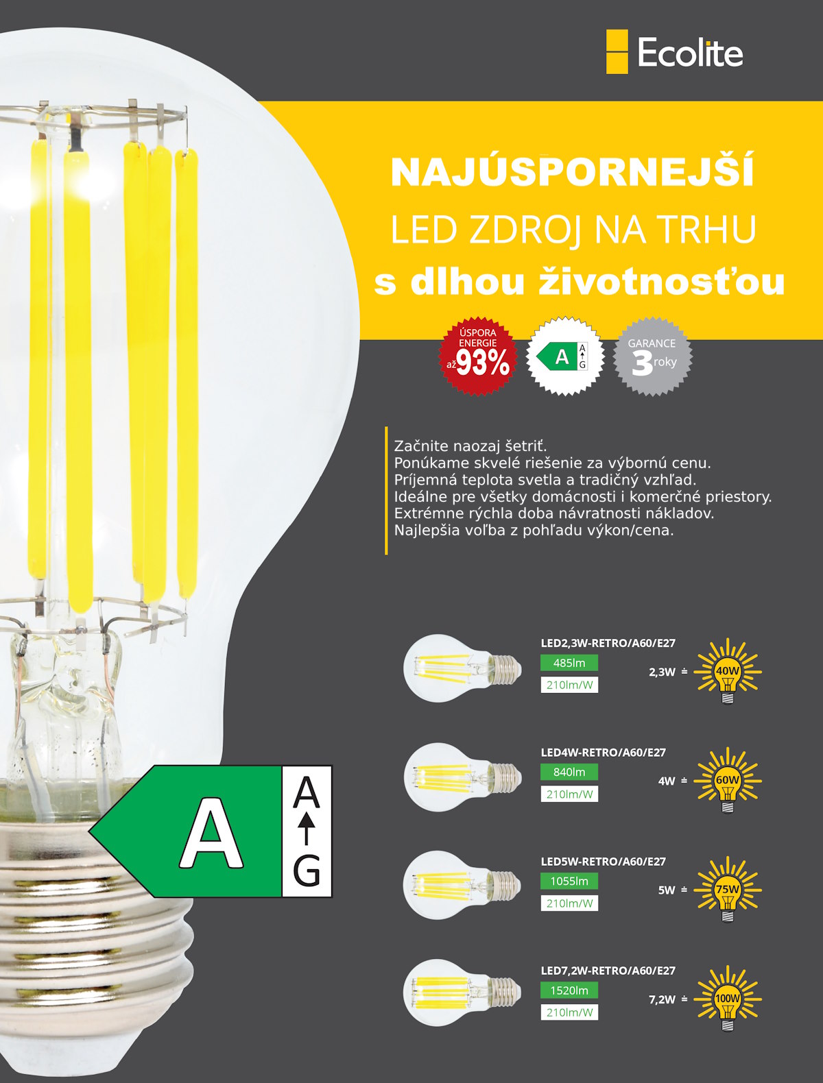 Rad Ecolite RETRO predstavuje oproti bežne dostupným LED žiarovkám obrovský výkonnostný skok a posúva sa tak približne na dvojnásobok svetelného toku.