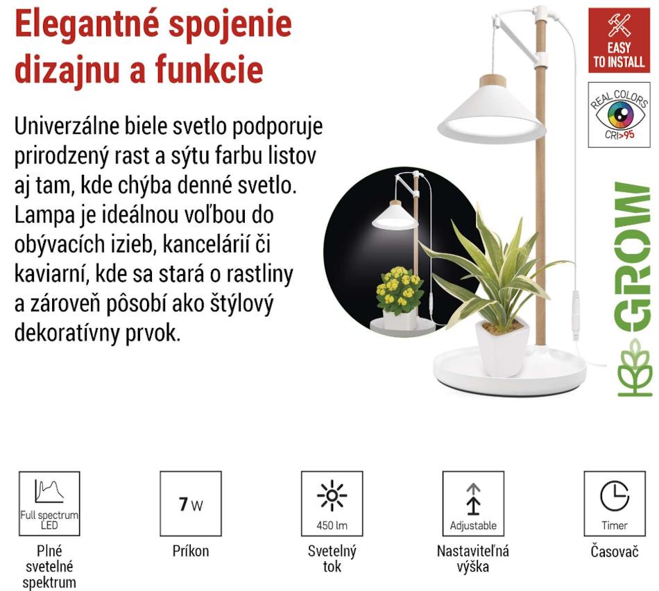 LED GROW pestovateľská lampa s výkonom 7 W je účelové osvetlenie navrhnuté pre podporu rastu izbových rastlín v interiéri. Pomáha doplniť svetlo počas období s jeho nedostatkom a vytvára prostredie, v ktorom rastliny dokážu efektívne fotosyntetizovať a vyvíjať sa zdravo aj bez dostatočného slnečného svetla.