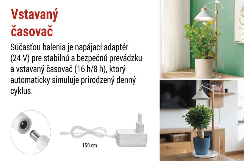 Vstavaný časovač zabezpečuje pravidelný denný režim osvetlenia bez potreby dennej obsluhy. Rastliny dostávajú svetlo v správnych intervaloch, čo výrazne uľahčuje starostlivosť aj menej skúseným pestovateľom. Súčasťou balenia je aj 24 V napájací adaptér, ktorý zaručuje stabilnú, bezpečnú a dlhodobo spoľahlivú prevádzku.