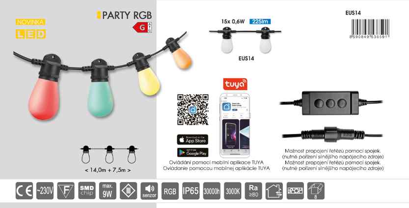 RGBW LED party reťaz EUS14 je prisadené vonkajšie osvetlenie so 15 pevne zabudovanými LED S14, určené na dekoratívne a atmosférické osvetlenie exteriérových priestorov. Umožňuje nastaviť farbu svetla v rozsahu RGBW pre rôzne svetelné efekty pri akciách, večierkoch či záhradných posedeniach. Párty reťaz EUS14 disponuje bluetooth pripojením pre ovládanie pomocou mobilnej aplikácie TUYA a vytvorí tak dokonalú atmosféru pre vašu oslavu alebo záhradné posedenie.