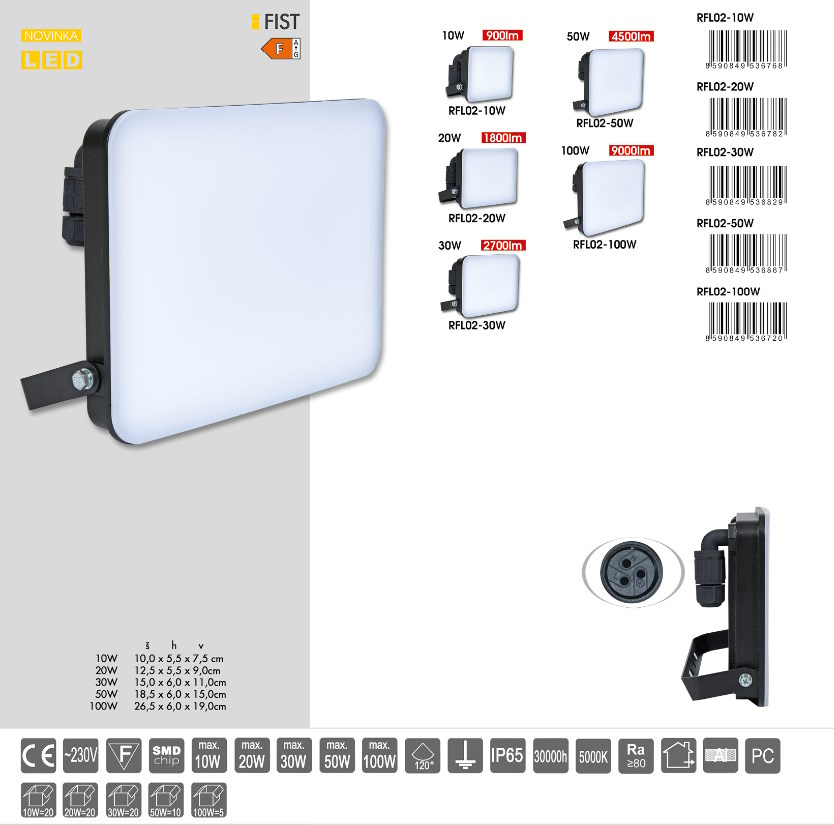Robustná konštrukcia s vysokým krytím IP65 zaručuje odolnosť voči prachu aj vode, vďaka čomu sú reflektory RFL02 vhodné aj do náročnejších vonkajších okolností, napríklad pri osvetlení fasád, chodníkov, parkovísk, skladov, výrobných priestorov alebo dielní.