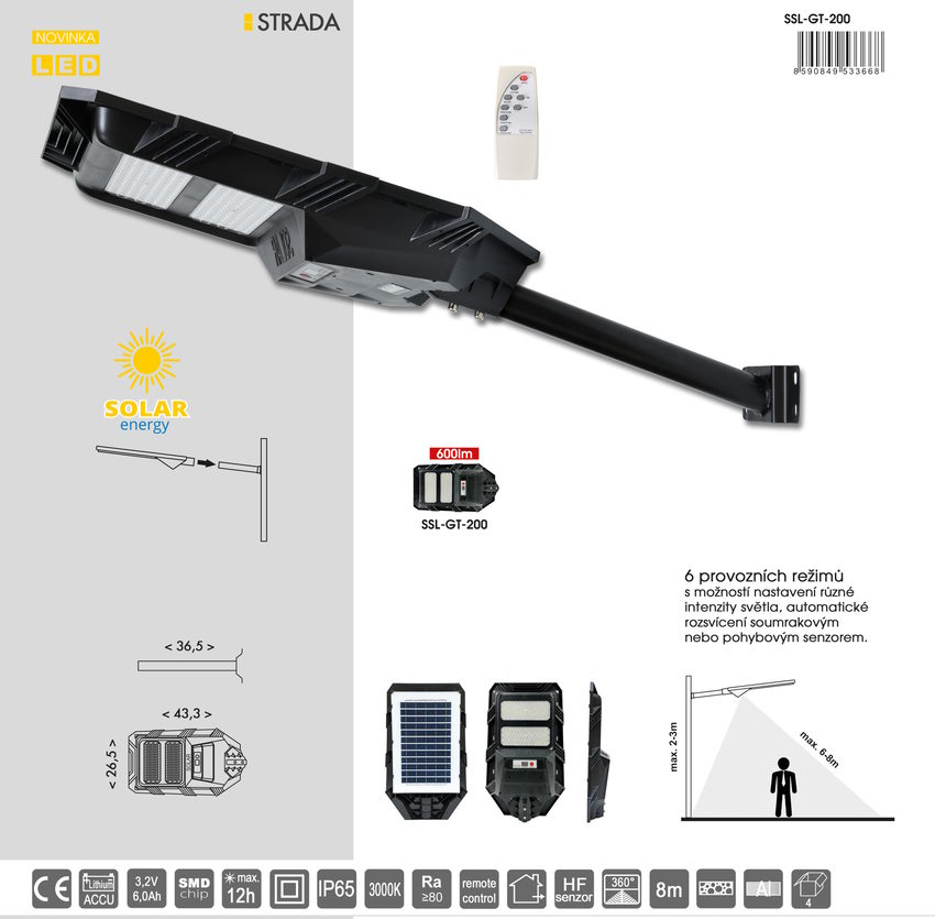 Napájanie: solárne + akumulátor 3,2 V / 6000 mAh
