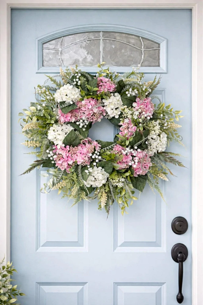 Celoročný veniec na dvere s umelými hortenziami v maxi priemere, približne 55cm