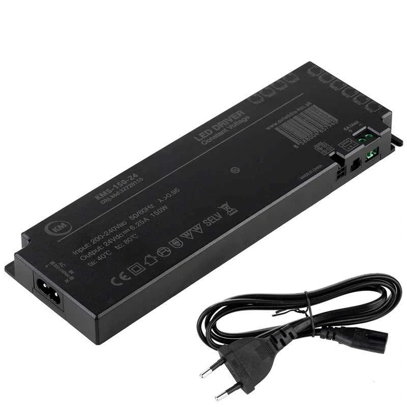 Napájací zdroj KMS-150-24 SMART LED, s výkonom 150W konštantným výstupným napätím 24V DC 6,25A v krytí IP20 s jedenástimi konektormi na výstupe (10 x max. 3A/výstup - na jeden výstup max. 72A celkovo max. 150W, 1 x max. 6A - 144W celkovo max 150W), konektorom na spoločné centrálne ovládanie všetkých výstupov pomocou externých vypínačov a senzorov a konektorom na prepájanie viacerých napájacích zdrojov za účelom synchronizácie ovládania. Napájací zdroj je v tenkom slim prevedení o rozmeroch 216x71x18mm vhodný pre inštaláciu do úzkych priestorov. Súčasťou je napájací kábel s dĺžkou 1,2m.