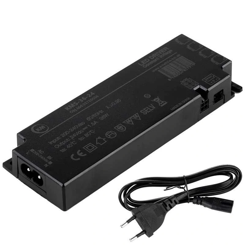 Napájací zdroj KMS-36-24 SMART LED, s výkonom 36W konštantným výstupným napätím 24V DC 1,5A v krytí IP20 so štyrmi konektormi na výstupe, konektorom na spoločné centrálne ovládanie všetkých výstupov pomocou externých vypínačov a senzorov a konektorom na prepájanie viacerých napájacích zdrojov za účelom synchronizácie ovládania. Napájací zdroj je v tenkom slim prevedení o rozmeroch 144x50x18mm vhodný pre inštaláciu do úzkych priestorov. Súčasťou je napájací kábel s dĺžkou 1,2m.