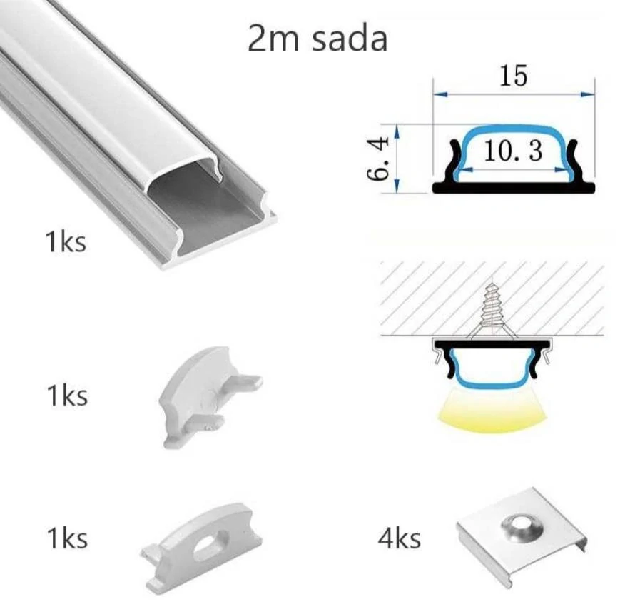 Sada lišty pre LED pásy KM24-S-MK-P 2m v striebornom farebnom prevedení určená pre prisadenú montáž o rozmeroch 15x6,4x2000mm. Balenie obsahuje: 1ks hliníkovej lišty s dĺžkou 2m, 1ks matný difúzor s dĺžkou 2m, 1ks koncovky bez otvoru, 1ks koncovky s otvorom, 4ks príchytky.