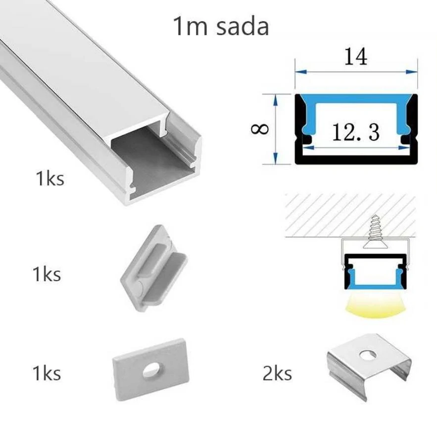 Sada lišty pre LED pásy KM35-S-MK-P 2m v striebornom farebnom prevedení určená pre prisadenú montáž o rozmeroch 14x8x2000mm. Balenie obsahuje: 1ks hliníkovej lišty s dĺžkou 2m, 1ks matný difúzor s dĺžkou 2m, 1ks koncovky bez otvoru, 1ks koncovky s otvorom, 4ks príchytky.