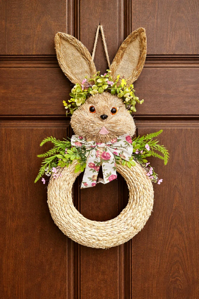 Jarný / veľkonočný veniec so zajačikom. Rozmery sú približne 29 x 60 cm