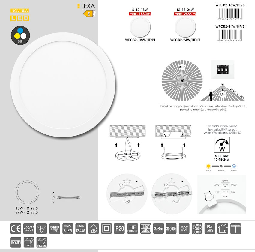 SMD kruh 30 cm vr. HF je LED svietidlo určené pre interiérové osvetlenie s integrovaným vysokofrekvenčným (HF) pohybovým senzorom, ktorý automaticky zapne svetlo pri detekcii pohybu. Svietidlo ponúka prepínateľný výkon 12 W / 18 W / 24 W a nastaviteľnú farebnú teplotu (CCT) 3000 K – 6000 K s celkovým svetelným tokom 2565 lm, v bielom prevedení vhodné pre chodby, kancelárie aj obytné miestnosti.