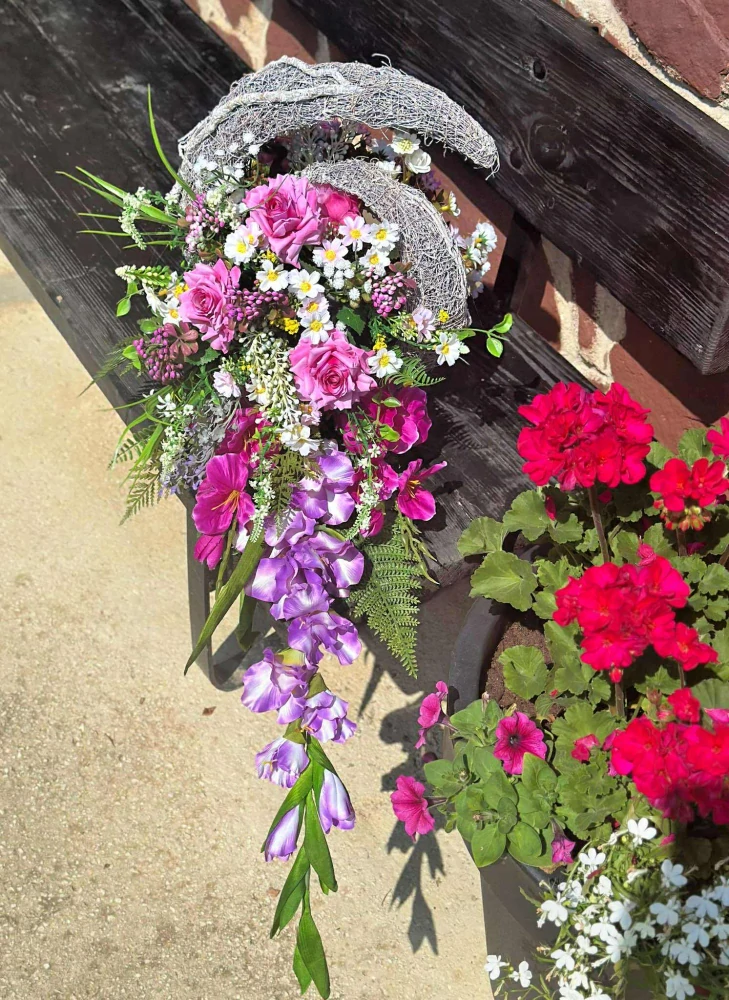Spomienková dekorácia na hroby v zaťaženom prútenom obluku.