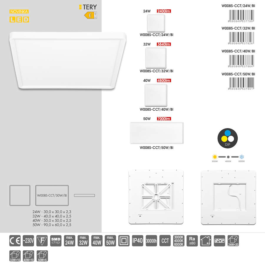 Stropné LED svietidlo TERY kombinuje minimalistický dizajn s vysokou svetelnou účinnosťou. Čisté línie a biely rámček zabezpečujú, že svietidlo zapadne do moderných aj klasických interiérov.