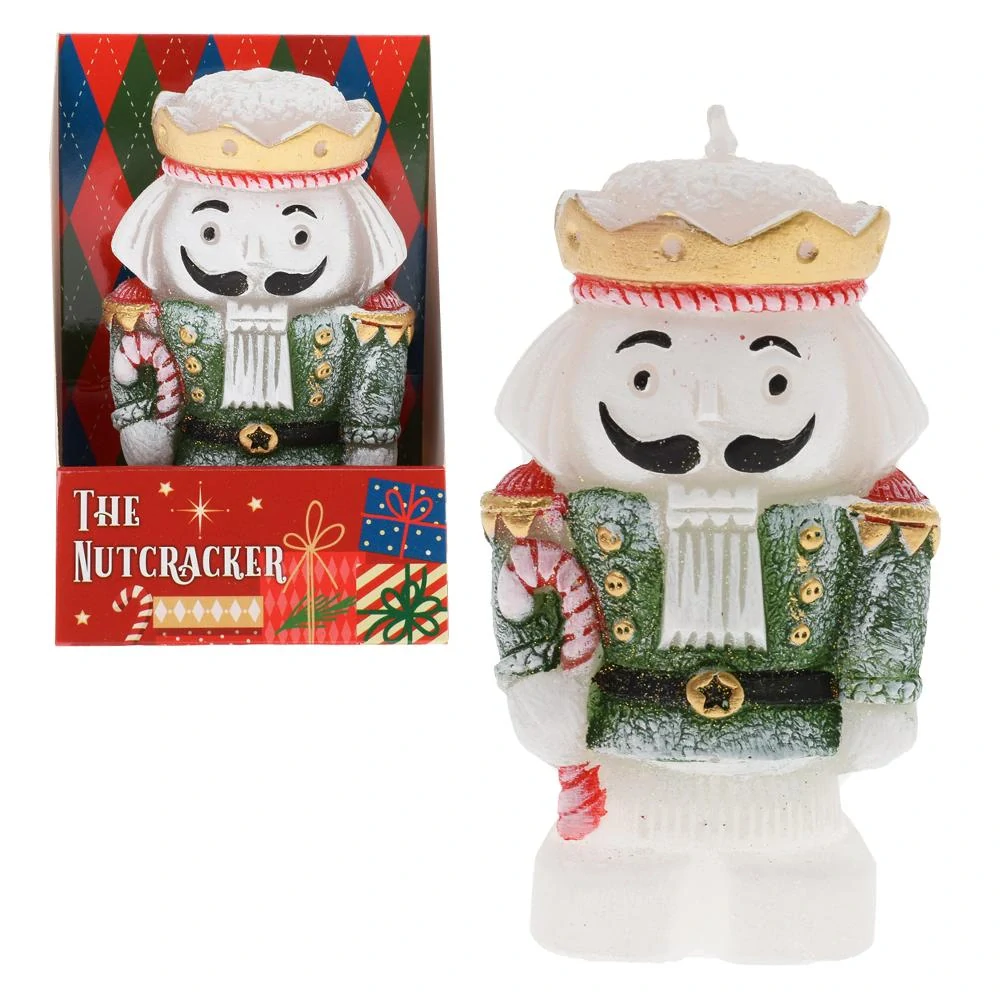 Vianočná sviečka The Nutcracker v tvare veselého zeleného Luskáčika je ideálnym doplnkom na sviatočný stôl či darčekom pre vašich blízkych. Sviečka s výškou 110 mm je detailne spracovaná, s trblietavými akcentmi a typickými prvkami tradičného Luskáčika, ako sú zlatá koruna, zelený kabát a výrazný fúz.