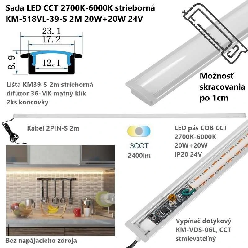 Sada LED CCT v striebornom prevedení biela, strieborná alebo čierna, s napájacím napätím 24V DC, výkonom 10W+10W pre dĺžku 1m a výkonom 20W+20W pre dĺžku 2m, nastaviteľnou farbou svetla CCT 2700K-6000K, svietivosťou 120lm/W, krytím IP20. Svietivosť a farbu svetla je možné nastaviť pomocou zabudovaného dotykového vypínača. Dĺžka napájacieho kábla 2PIN-S je 2000mm. LED sadu je možné podľa potreby krátiť na požadovaný rozmer s presnosťou na 1cm. Pri krátení LED sady zdemontujete koncovku na konci kde nie je napájací kábel, zdemontujete difúzor, odlepíte nepotrebnú časť LED pásu a odstrihnete ju nožnicami v mieste medených kontaktov, nacvaknete difúzor a pílou odrežete nepotrebnú časť lišty aj s difúzorom, namontujete koncovku. LED sada je určená na zápustnú alebo prisadenú montáž.