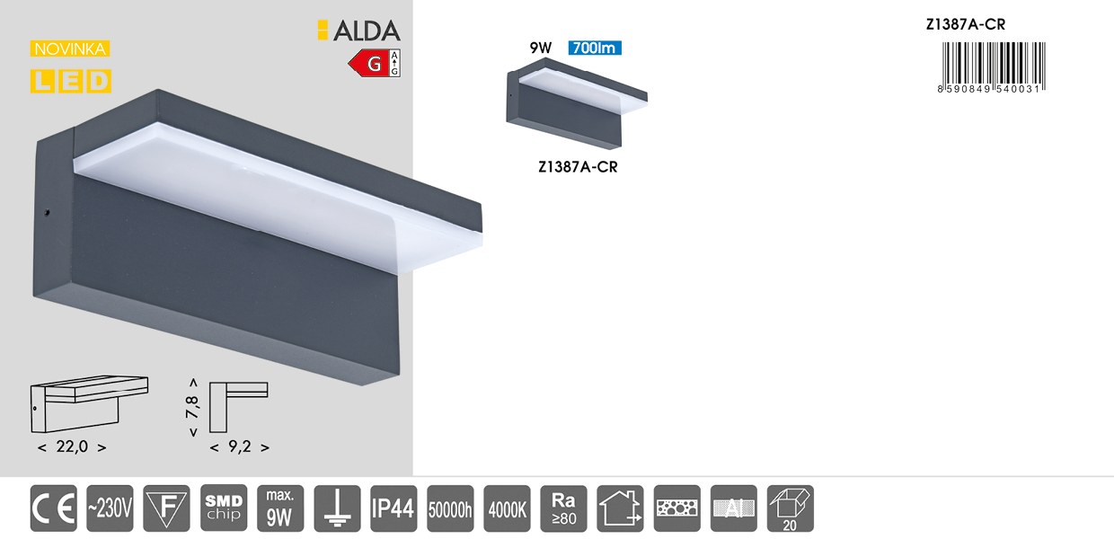 (Informácie o tomto svietidle vychádzajú z dostupných technických údajov pre model ALDA 9 W s označením Z1387A-CR.)