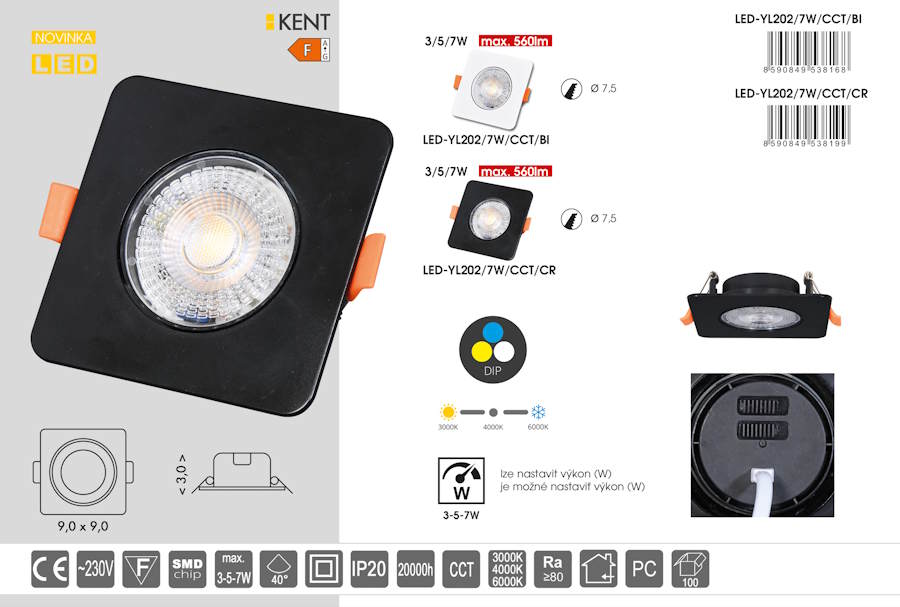 LED vstavané svietidlo KENT je univerzálne riešenie pre moderné interiérové osvetlenie. Vďaka technológii CCT umožňuje jednoduché prepínanie medzi teplou, neutrálnou a studenou bielou farbou svetla (3000 / 4000 / 6000 K), čo poskytuje flexibilitu osvetlenia podľa aktuálnych potrieb a nálady.