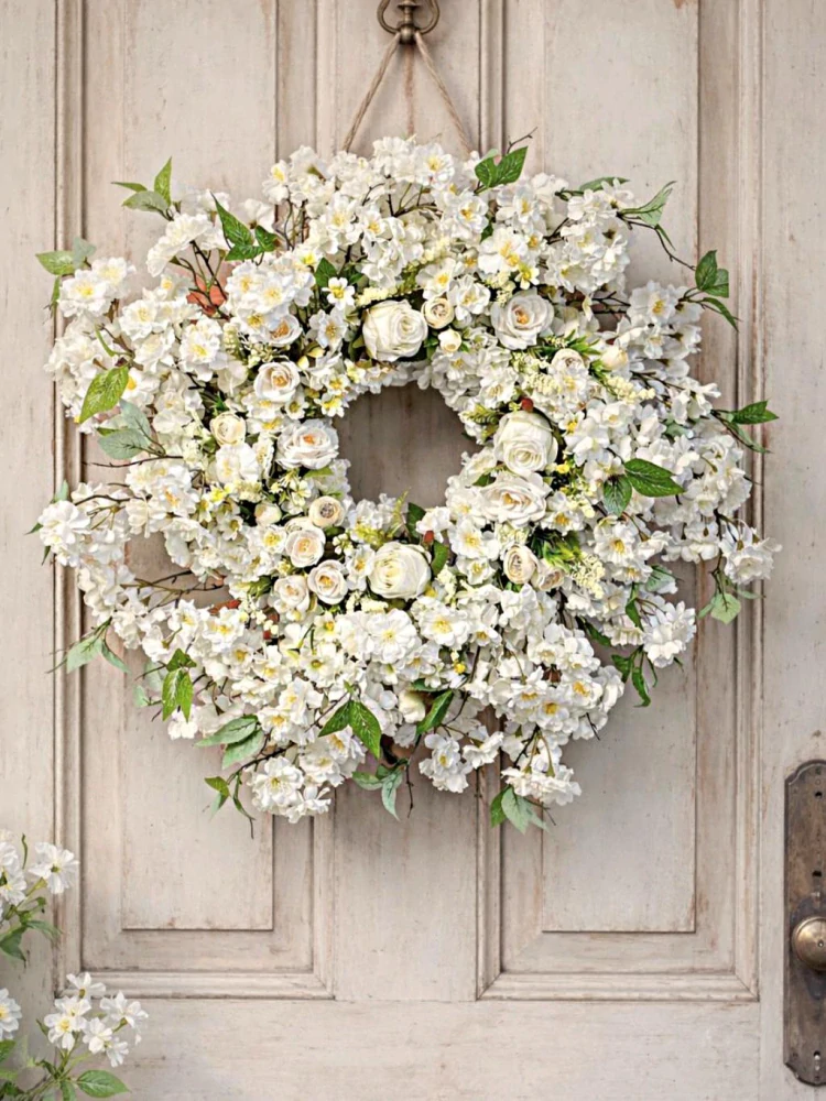 Jarný alebo celoročný bohato zdobený veniec s bielou sakurou a ružičkami.