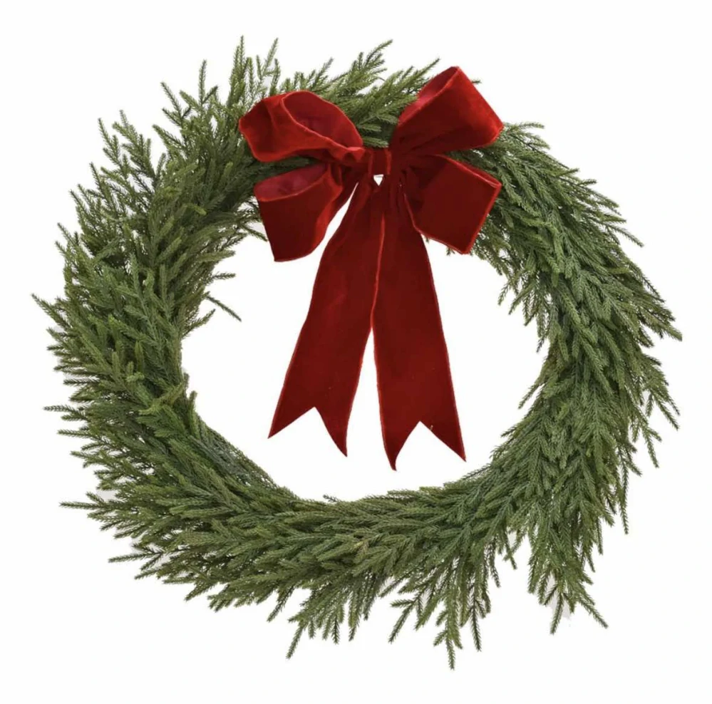 Obrovský vianočný veniec s červenou zamatovou mašľou, priemer 85cm. Veniec vhodný na brány.